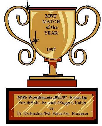 Was matched against fellow NWA member Rugged Ralph in the opening round of the 1997 King of the Ring tournament. Wrestled a surprisingly violent encounter with his associate in a 1997 match of the year candidate, but ultimately lost to Ralph after being shocker-dropper-ed thru a table. As a result of a $100,000 bounty placed on Brother Fiend's NWA partner Rugged Ralph by Destruction, faced Dr. D in a lumberjack-with-straps match at MWF WrestleMania 1997 and defeated him in the 1-on-1 encounter but extended his hand to his foe in giving him a tough match, which was apparently accepted by Destruction, who shook his enemy's hand. Later on the card, however, teamed with Bravado and Rugged Ralph to face Destruction and the Coalition in a 6-man match in which the loser of the fall must retire. At the climax of the match, Destruction seemed to turn on his partner Private Parts, and extended the briefcase containing the bounty for Brother Fiend to use against Private Parts. This was a deception by Destruction, however, as Brother Fiend raised the briefcase, Destruction drop-kicked it into his head, and scored the fall causing Brother Fiend to be retired to close out 1997.
