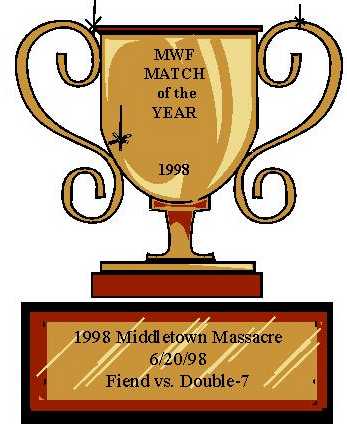 At Middletown Massacre 3, was matched against Double-7 in a U.S. title match. Fought the champion in a match that was voted Match of the Year in 1998. After a seesaw match, was pinned by Double-7 following interference from Buford T. Justice. At MWF Independence Day 1998, faced the man that had caused his loss to Double-7, Justice, but Justice had himself joined Rugged Ralph's side of the warring NWA renaming himself B.T. Vengeance. Brother Fiend gave Vengeance a run for his money, but Vengeance ultimately side-slammed him for his patented 5-count. With the retirement of NWA founder Rugged Ralph and the disappearance of Bobo Bravado, the two NWA splinter groups apparently sought to reconcile their differences. At MWF In Your Face August Armageddon, Brother Fiend teamed with Mountain and Vengeance in a 6-man match against the MWF team of World champ Destruction, Mike Speedo, and Franchise Brett Krueger. The NWA team managed to take advantage of a miscommunication between Destruction and Krueger, and took the victory. After the match, Brother Fiend and Mountain violently assaulted Destruction. This confrontation led to a 3-way dance at Summer Showdown between Fiend(now dropping Brother from his name), Mountain, & Destruction for the Doc's MWF World title. Prior to that match, however, Fiend apparently sought to do things on his own instead of working with the NWA any longer. Enlisted the services of the MWF newcomer Carnage, and together, they appeared at the conclusion of the C.I.A. & Deathmask vs. Coalition match-up. Despite their having been beaten by the Coalition, C.I.A. & Deathmask were invited by Fiend and Carnage to join Fiend's new Flock. Initially, the two partners refused, thus they were brutally assaulted by Fiend and Carnage and left laying. Then, in the main event 3-way dance, Fiend squared off with Mountain of Love and Dr. Destruction for the MWF belt. Unfortunately, Dr. Destruction was able to take advantage of Fiend battling Mountain and managed to eliminate Fiend from the match after executing a senton onto a ladder placed atop him.