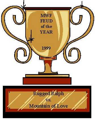While Dr. Destruction was out of commission, the MWF held its Saturday Slugfest 5 event. Rugged Ralph challenged the Mountain of Love to a 6-man tag team match where neither he nor Ralph would know who their partners were. So enfuriated was the MOL following Ralph's turn against the Hard Corps, he put his MWF World title on the line in the bout should anyone on Ralph's team beat him. This proved the Mountain's undoing as Rugged Ralph somehow knew in advance that he would be teamed with the Reds, and convinced them to aid his beating Mountain. With the help of the Reds, specifically with each Red holding a leg of the Mountain from outside the ring, Rugged Ralph covered the Mountain and pinned him to become the NEW MWF World Champion.