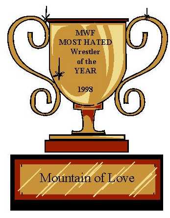 The Mountain of Love was a fighting champion, and proved it by defending the U.S. title against NWA enemy Dr. Destruction on the first card of 1998, Spring Fling. Pinned Dr. Destruction after applying his finisher, the Death-Valley-Driver, onto a metal ladder that Destruction had brought into the ring. This manuever severely injured the neck of Dr. Destruction, who required a neck-brace afterwards. The 2 antagonists met briefly again during the 9-man Elimination Confrontation event which was to decide the new MWF World champion, a title forfeited by Mike Speedo in late 1997. Dr. Destruction proved too intent on gaining revenge on the Mountain, however, as the Mountain distracted Dr. D allowing the recently reinstated formerly-retired Brother Fiend the chance to eliminate him from the event. The Mountain, however, allowed himself to be put into Fiend's Fiendmission hold to get over the fact that Brother Fiend had been fighting on the side of the MWF to enable Fiend to get reinstated into the MWF for this match. The NWA's plans for takeover backfired however, as Mike Speedo defeated Bobo Bravado to take back the MWF World title he had forfeited. This seemed to be the final defeat the NWA was willing to tolerate at the hands of the MWF. At Lunatic Fringe, the Mountain of Love was a very busy man. He started out with his next successful U.S. title defense pinning the Phantom Shadow following a "Mangler" power-bomb. He later came down to ringside during the Dr. Destruction - Double-7 Chris Simmons match to attack Dr. Destruction who had vowed revenge against the Mountain for injuring his neck at Spring Fling. His presence, back-fired, however, as he mistakenly struck Double-7 with a steel chair meant for Destruction. In effect, he had created for himself another enemy in Simmons. Still later on that card, assisted Rugged Ralph in a post-match attack on Brett Krueger who had just been defeated by the MWF World champion Mike Speedo. Along, with Ralph and former Krueger F.U.C.K.T. member C.I.A., handed out a dastardly beating to the MWF's Franchise severely injuring him. At MWF In Your Face, Nowhere to Hide, the Mountain of Love teamed with NWA partner Brother Fiend to take on Dr. Destruction, and his tag-team partner Double-7 Chris Simmons. The MWF tag-partners got the upper hand as Destruction doctor-bombed Mountain of Love onto a steel chair and went for the cover. Double-7, however, turned on his own partner and leg-dropped a chair onto Destruction during the pin attempt and made the cover on Mountain himself for the pinfall victory. For pinning the champion in the tag match, Double-7 earned the right to challenge the Mountain for the U.S. title at BattleBowl 1998. Despite wrestling one of his finest matches, the Mountain did indeed drop the U.S. title to the young challenger as he became a victim of the dreaded Double-7 death-drop. Sought to take out his displeasure at losing the belt by wrestling a preliminary opponent Red Satan at Middletown Massacre 3. Throttled Red Satan for the majority of the match, but could not seem to put him away easily. Then, Mountain got the upper hand, and lifted the mask of Red Satan and apparently saw who it was. Shocked at his discovery, the Mountain became the recipient of a inverted Russian-legsweep and was pinned by the masked man, who promptly left the ringside area, his identity intact. Later on the card, accompanied Rugged Ralph to ringside in his match against Mike Speedo. Chased away from ringside Speedo's then-manager, the masked ZODIAC. Later during the match, ZODIAC appeared sans Mountain leading all to assume that somehow he had gotten the better of Mountain back in the dressing room area. However, with Rugged Ralph distracting the referee, "ZODIAC" entered the ring, gave Speedo the Death-Valley-Driver, and unmasked revealing himself to indeed be the Mountain of Love. A shocker-dropper bulldog from Rugged Ralph later, and Speedo had been defeated. Ralph and Mountain then proceeded to kick Speedo down and could have put him out of wrestling as they had Brett Krueger, but the masked Red Satan came down to ringside, tore off his mask, and revealed himself to be in fact Brett Krueger who cleared the ring of the NWA. Was to receive a MWF World title shot at the new MWF champion Dr. Destruction at Independence Day 1998, but Bobo Bravado had earlier taken out his scheduled opponent Mike Speedo and demanded his own title shot against Speedo's brother, Dr. D. Thus, the match with Dr. Destruction became a 3-way dance for the MWF World title involving BOTH the NWA's Bobo Bravado and Mountain of Love. Although initially dismayed that his match with Destruction was not 1-on-1, Mountain agreed and along with his fellow NWA-ite Bravado, brutally double-teamed Dr. Destruction in the 3-way Weapons match. Beating the champion unmercifully for several minutes, Mountain of Love held Destruction for Bravado to clothesline. Destruction ducked, however, and the clothesline struck the Mountain. Thinking the attack purposeful, the Mountain began to tear into Bravado as well. Finally, the Mountain of Love was eliminated thanks to a double-team spike-piledriver from both Destruction and Bravado and was pinned by Bobo. Enraged that Bobo had cost his chance at the match and the title, Mountain refused to leave ringside, and got the opportunity to DVD Bobo. Destruction followed this attack up with a flying elbow-smash from the top rope and Bobo was pinned ending the match. The Mountain left the ring in disgust, the NWA in complete upheaval. This was only compounded the following card at MWF In Your Face 2 - August Armageddon. Rugged Ralph, the NWA's founder had announced his retirement and prepared to square off against Bobo Bravado at the event in his last match, but Bobo no-showed, and Mountain stepped up to battle his former partner. Rugged Ralph, however, disrespected everything the NWA had done, and returned to his roots calling himself Rockin Rich, his first MWF incarna