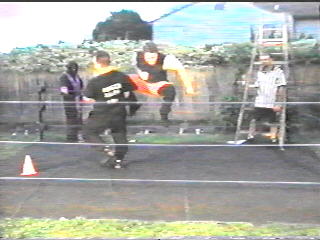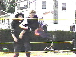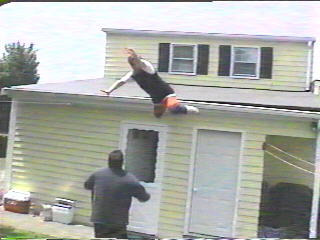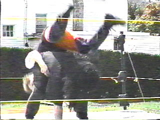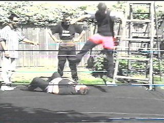 In a falls-count-anywhere match, Mike Speedo executes a flying bodypress